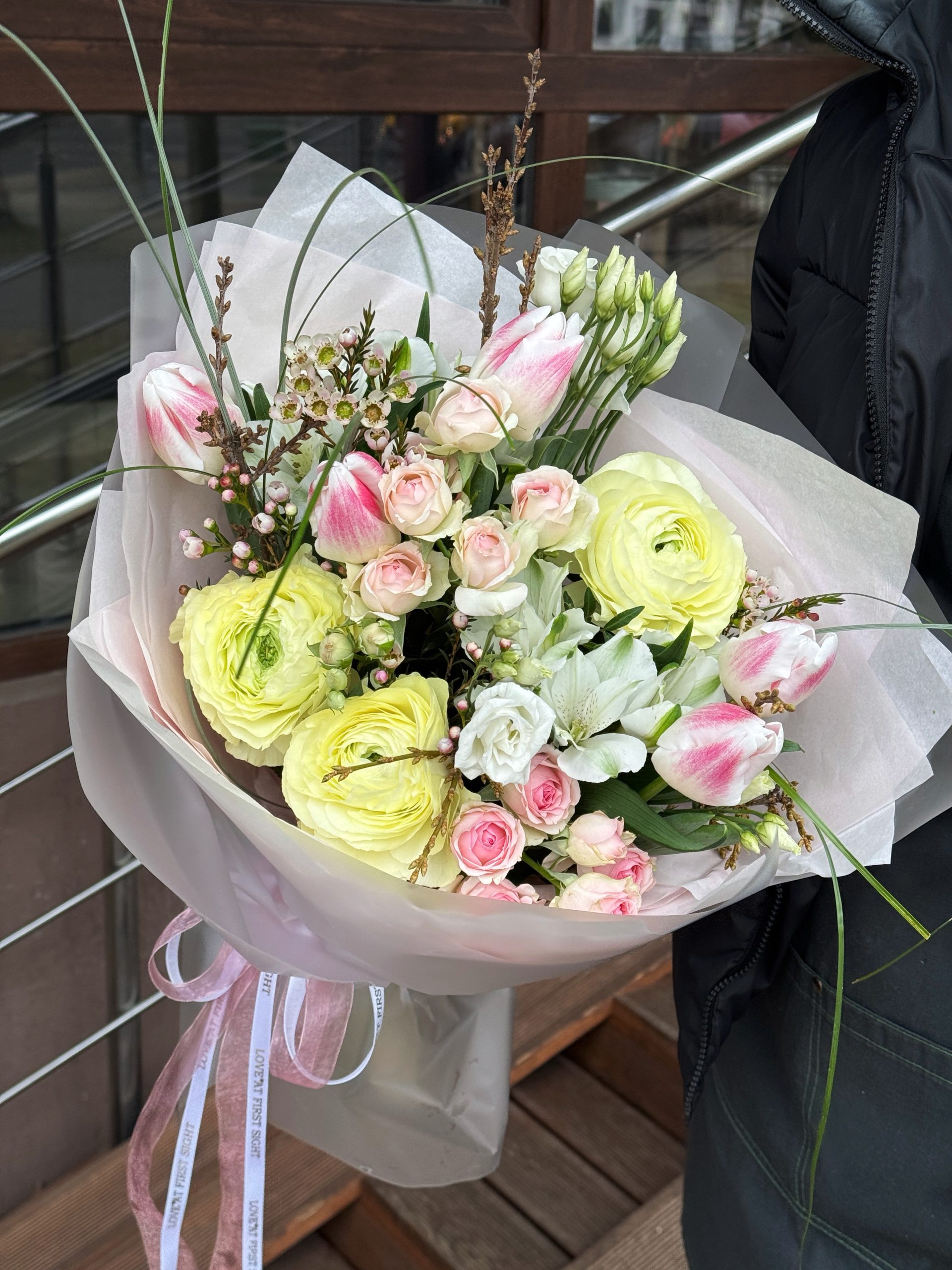 ранункулюс 3 шт роза кустовая 2 шт тюльпан 5 шт альстромерия 1 шт эустома 1 шт хамелациум