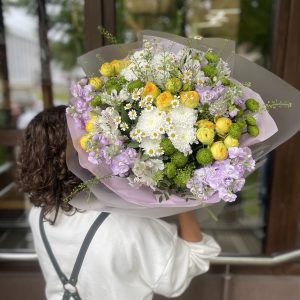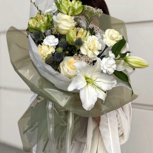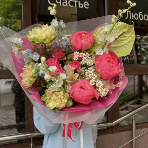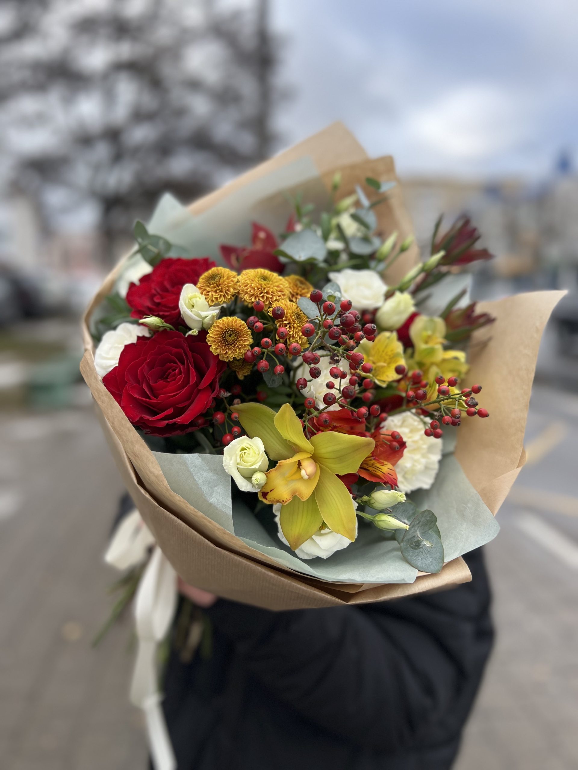 роза красная 3шт хризантема сантини 2шт альстромерия 3шт орхидея 1шт эустома 2шт гвоздика 2шт эвкалипт шиповник