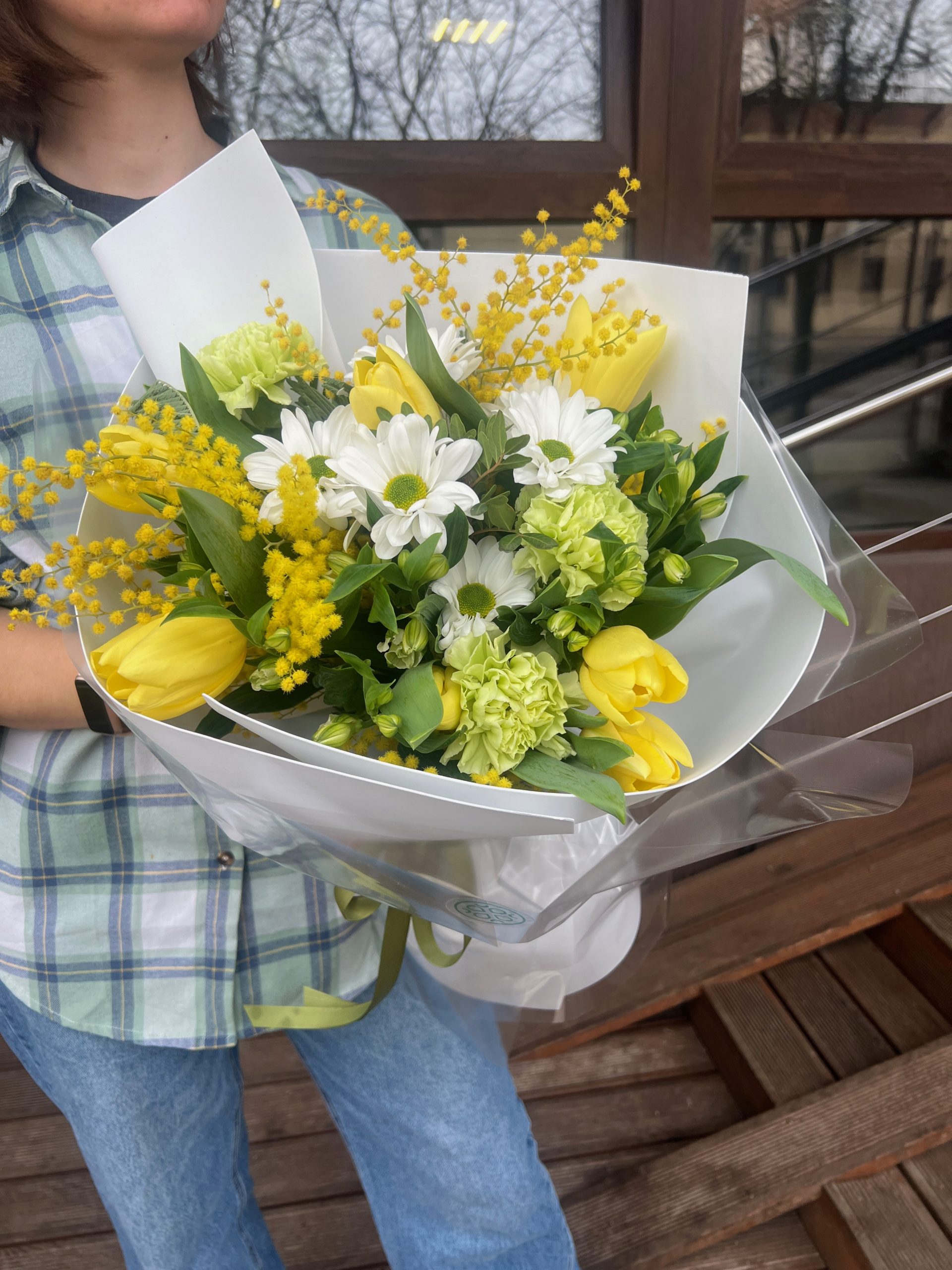 тюльпан желтый 7 шт гвоздика 3 шт хризантема 1 шт альстромерия 2 шт мимоза