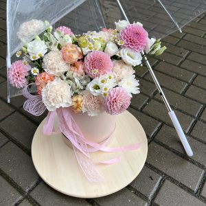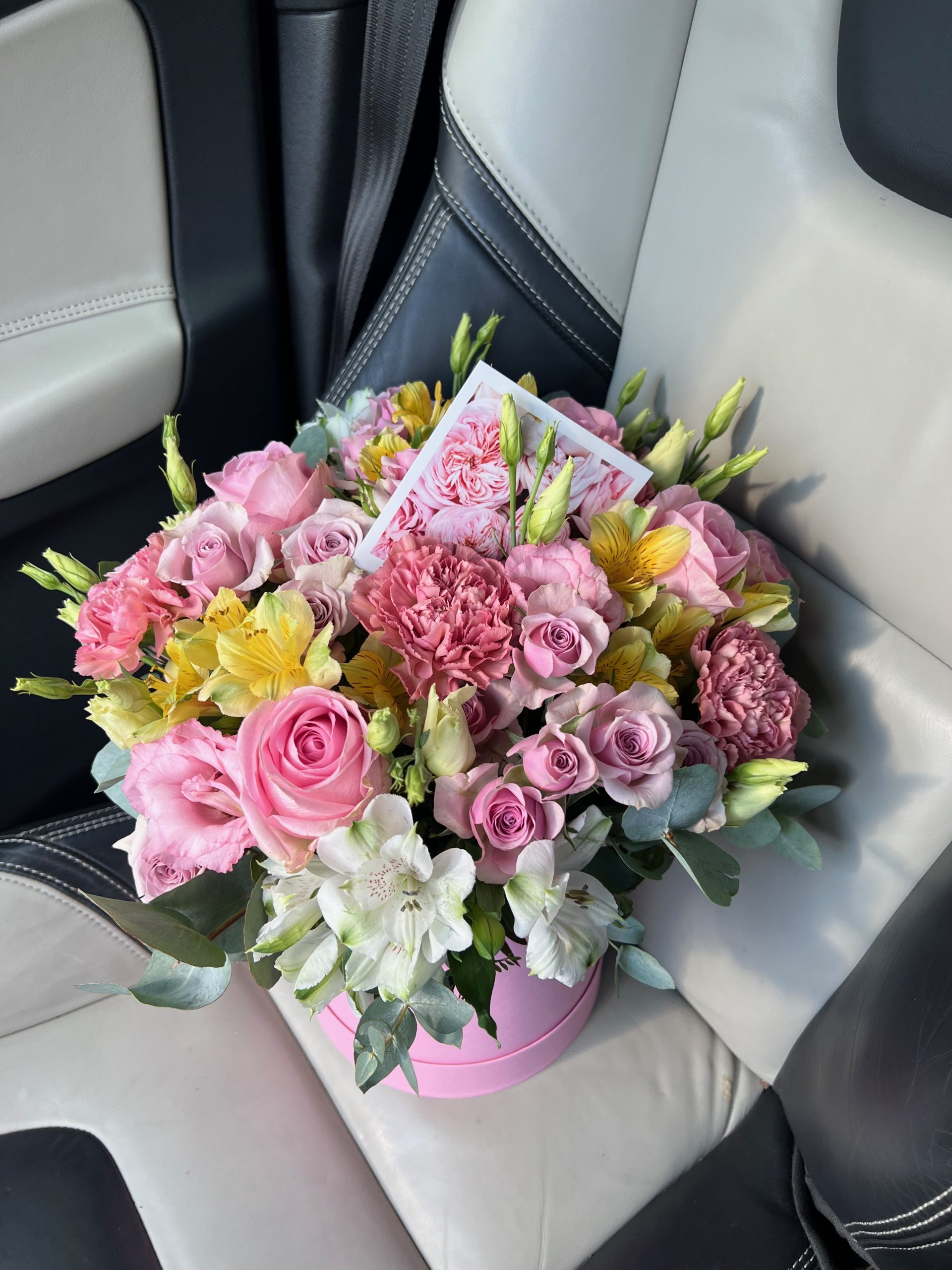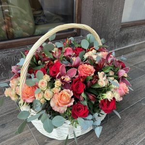 Микс из альстромерии, кустовой розы, эустомы, одноголовой розы, эвкалипта